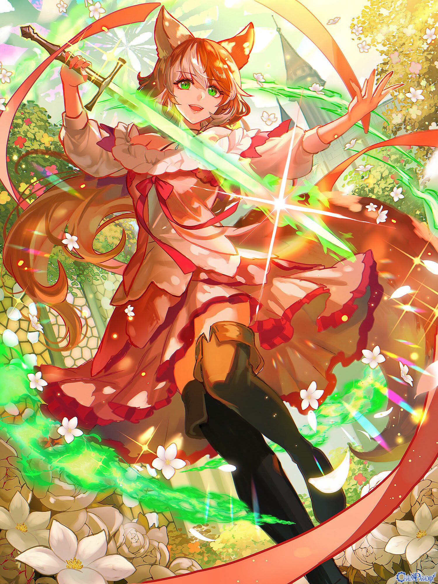 愛用の十字剣に祈りを捧げ、神の奇蹟たる緑玉色の炎をその身に宿す。燦然と輝きながら燃え盛る緑炎は、十字剣を振るうたびに解き放たれ、敵対者を神の名の下に灼き尽くす。炎は後光ともなり、奇蹟の娘の訪れを告げる。