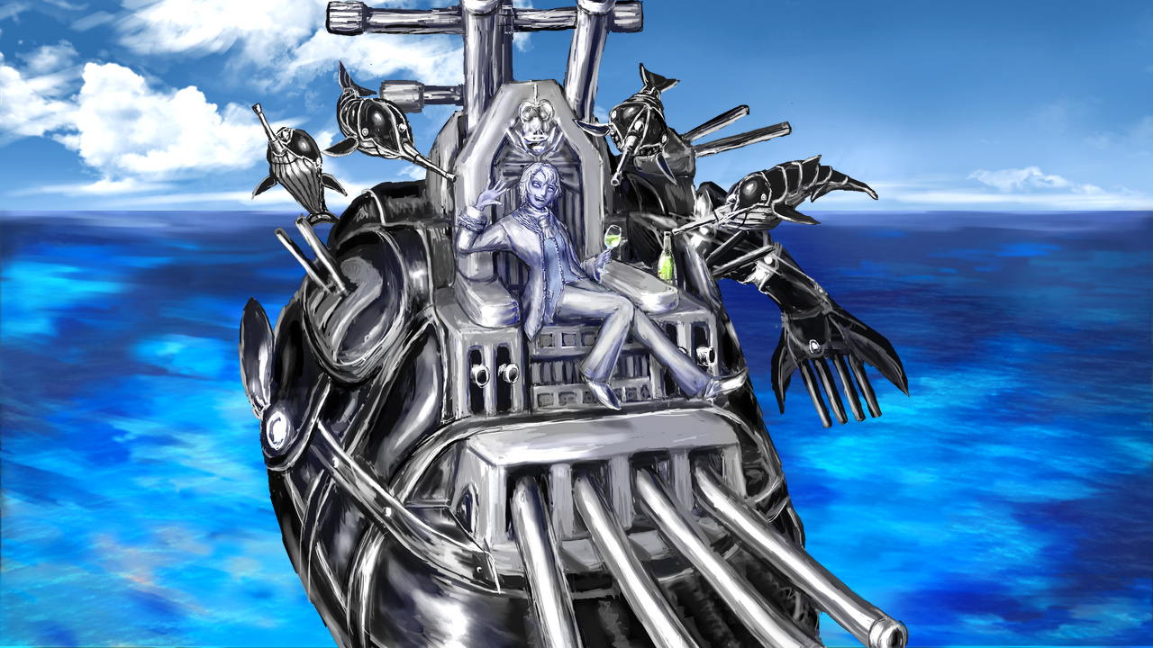 太平洋の広い地域にまたがるディヴィジョン『冥海機ヤ・ウマト』を支配する、人間が「第二次大戦期前後の兵器」や「海の生物」と融合したような姿のクロノヴェーダです。『海戦』にまつわる人間の感情の動きや落命からエネルギーを回収します。