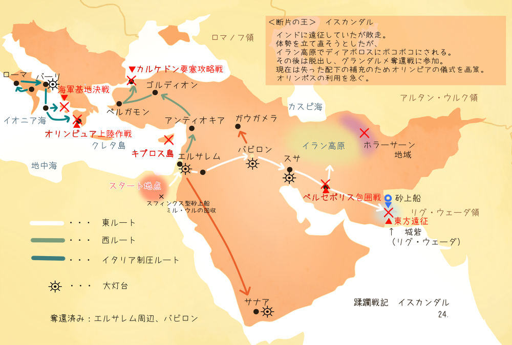 ➡ディヴィジョンの基本情報 ✔紀元前4世紀のイスカンダル(アレクサンドロス3世)の大帝国を中心とした地域を支配するディヴィジョンです。 ✔断片の王は「イスカンダル」、支配種族は亜人(ディアドコイ)です。 ✔イタリア及びバルカン半島で最終人類史、トルコで『吸血ロマノフ王朝』、中東で最終人類史、南アジアで『アルタン・ウルク』『蛇亀宇宙リグ・ヴェーダ』と接する巨大帝国です。 ✔「大灯台」について ・ディヴィジョン各所に複数存在する建造物型クロノ・オブジェクト「大灯台」には、光源でもある黄金正二十面体型クロノ・オブジェクト『ファロスの光』が持つ『亜人と人間での繁殖を可能にする効果』を周辺地域全体に広げる役割があり、ディヴィジョン戦略の根幹を担っています。 ✔広大な地域を有し、ギリシャや西アジアの文化を中心に、時代の異なる中東文化の混淆も見られます。 ✔亜人は人間女性と交わって亜人を産ませる事が可能で、侵略戦争により戦力を増やし続けていきます。 ✔亜人と交わった人間女性は出産の負担に耐えられずに出産後に命を落としてしまい、男性は『蹂躙』による精神エネルギー搾取のために殺害されていくため、ディヴィジョン内の人間の数は減少し続けています。 ✔亜人に仕える異種族として『ウェアキャット』が存在し、亜人達が行わない生産活動や兵站・荷運びなどの労働に従事しています。 ✔『魔術』が実在しますが、亜人の力と認識され、ディヴィジョン内の一般人には使えない模様です。 ✔一部地域の人間には、かつて亜人に逆らった『勇者』や『冒険者』と呼ばれた者達の伝承が記憶されていました。敗北し、なかったことにされたディアボロスの記憶が僅かに残っていたものと推測されています。 ✔断頭革命グランダルメ奪還戦以後の蹂躙戦記イスカンダルの方針 ・『オリンピアの儀式』によるジェネラル級の確保と、『イタリア半島の再蹂躙』を目論む ・グランダルメの『他のディヴィジョンや種族を利用する』姿勢に影響を受け、『オリンポス』のさらなる利用を急いでいる ✔ディアドコイ評議会の再編成 ・ディアドコイ評議会の構成員は『ピュロス1世』『ダレイオス3世』『パイリサデス1世』『起源王ロームルス』『怪物の父テュポーン』に再編成された。 ・『ピュロス1世』は断頭革命グランダルメ奪還戦で死亡した『単眼王・アンティゴノス』の領土を引き継いでいる。 ・『パイリサデス1世』はクリミア半島の支配者である。 ・『起源王ロームルス』は『イタリア半島の再蹂躙』の準備を進めている。 ✔イスカンダルに征服され滅亡した古代ギリシャのディヴィジョン『神威断罪ギガントマキア』がかつて存在し、「神像鎧」などクロノ・オブジェクトが流用されている。 ✔神威断罪ギガントマキアのクロノヴェーダは総勢100に達するかどうかの少数だが、全員が将と呼べるほどの強さを備えていた。 ✔イラン(ペルシア)方面の重要都市ペルセポリスはジェネラル級亜人『ダレイオス3世』が防衛中だったが、蛇亀宇宙リグ・ヴェーダ側に寝返った。 ✔オリュンピアの儀式には「ギリシャの女神」が関係している可能性がある ✔🆕マケドニアの『ペラ』は「王都にふさわしい華やかな街」らしい ✔🆕『スパルタ』は現地出身と思われる亜人に「蛮地」と評されていた ✔🆕東方の蛇亀宇宙リグ・ヴェーダが制圧する城砦で働かされている一般人は、蹂躙戦記イスカンダルの人間ではない模様。 ✔🆕空飛ぶ島に乗せられて連れてこられたらしい。 ✔🆕現在のイスタンブールにおける対ディアボロス防御はカルケドン側に集中していて、ビザンチウム側は手薄な可能性がある ✔🆕カルケドンを防衛する亜人は、断頭革命グランダルメ奪還戦で死亡した『若獅子ヘラクレス王子』の配下だった。 ✔🆕トラキア方面の支配者は『勇猛なるリシュマコス』。断頭革命グランダルメ奪還戦で生還した。 ✔🆕『アキレウス』はスパルタかアテネに縁があるらしい。 ✔🆕ホラーサーン&新型アルタン・ウルク関連 ・《七曜の戦》では沢山の亜人がアルタン・ウルクに喰われた。その後も法正からこの地を死守する命令を受けた。逃げようとした者は粛清された ・《七曜の戦》の後、アルタン・ウルクの多くはイスカンダルから出ていったが、その後も残った一部の亜人を捕食したアルタン・ウルクが亜人のような形状のアルタン・ウルクとなった ・アルタン亜人にも【泥濘の地】による移動速度の低下は効く ・使用パラドクスは通常アルタンとは異なる ・司令塔からの意思を共有するかのような動きは亜人アルタンもこれまでのアルタンと同じに見えた。一体あたりの強さはともかく、集団敵としてはより手強くなっていた ・発する言葉は『シュゴー』のみ。会話は不能 ・撃破直後、アルタン・ウルクの赤い眼光が弱まり、アルタンに取り込まれた亜人が助けを求めるかのような動きをした ・亜人アルタンの形状は、大量に取り込んだ亜人